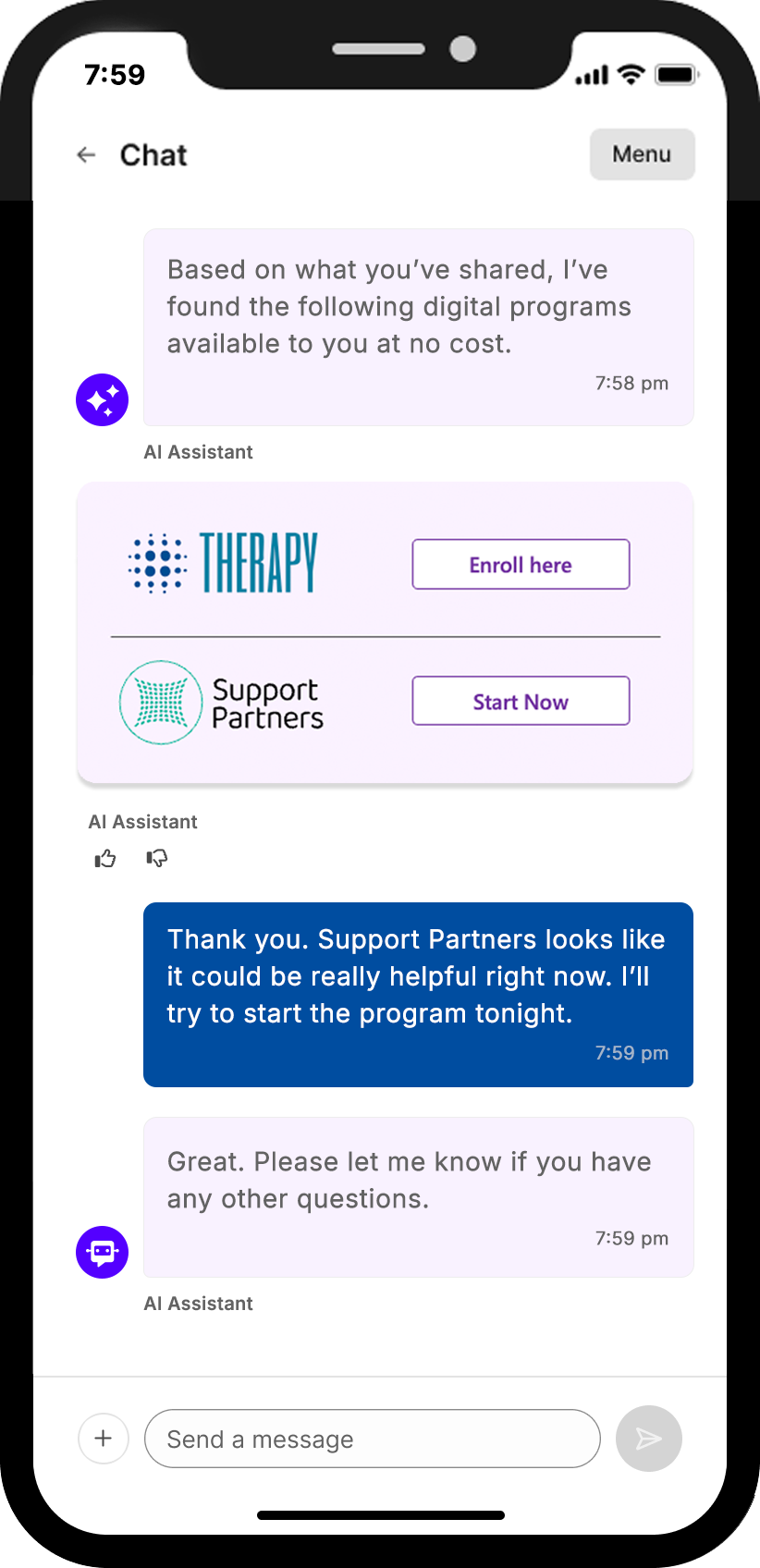 Available in DecemberOur conversational AI now directs members to the right virtual BH program by interpreting natural language or guided prompts. It evaluates eligibility, surfaces high-value options, detects emergencies, and routes to a human when needed. The experience also includes feedback capture and detailed reporting on program effectiveness.
